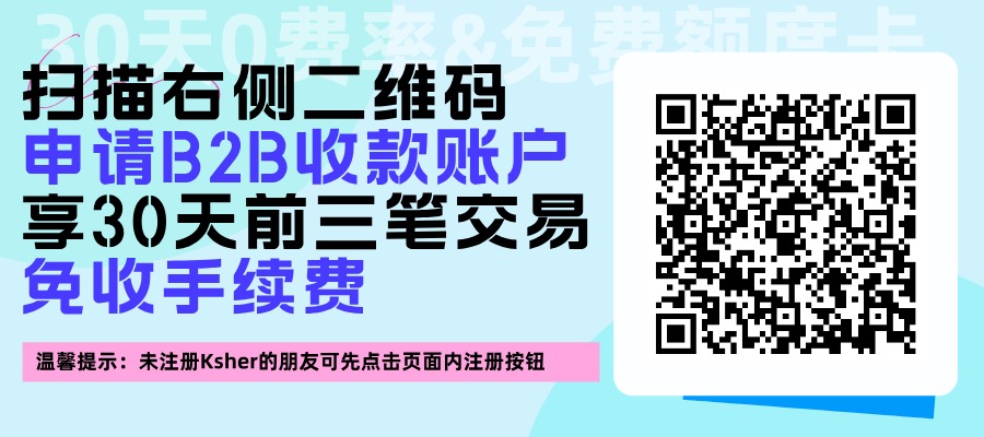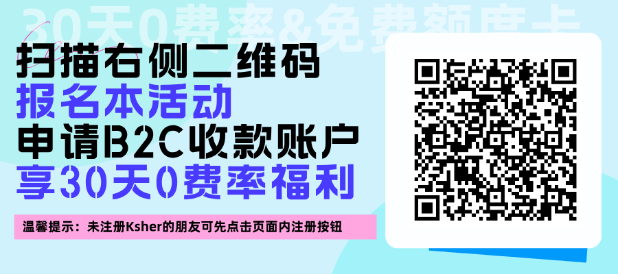 不限新老用户,覆盖B2B及B2C两大业务类型,申请首个Ksher收款账户,0费率&免费额度卡double福利轻松get!