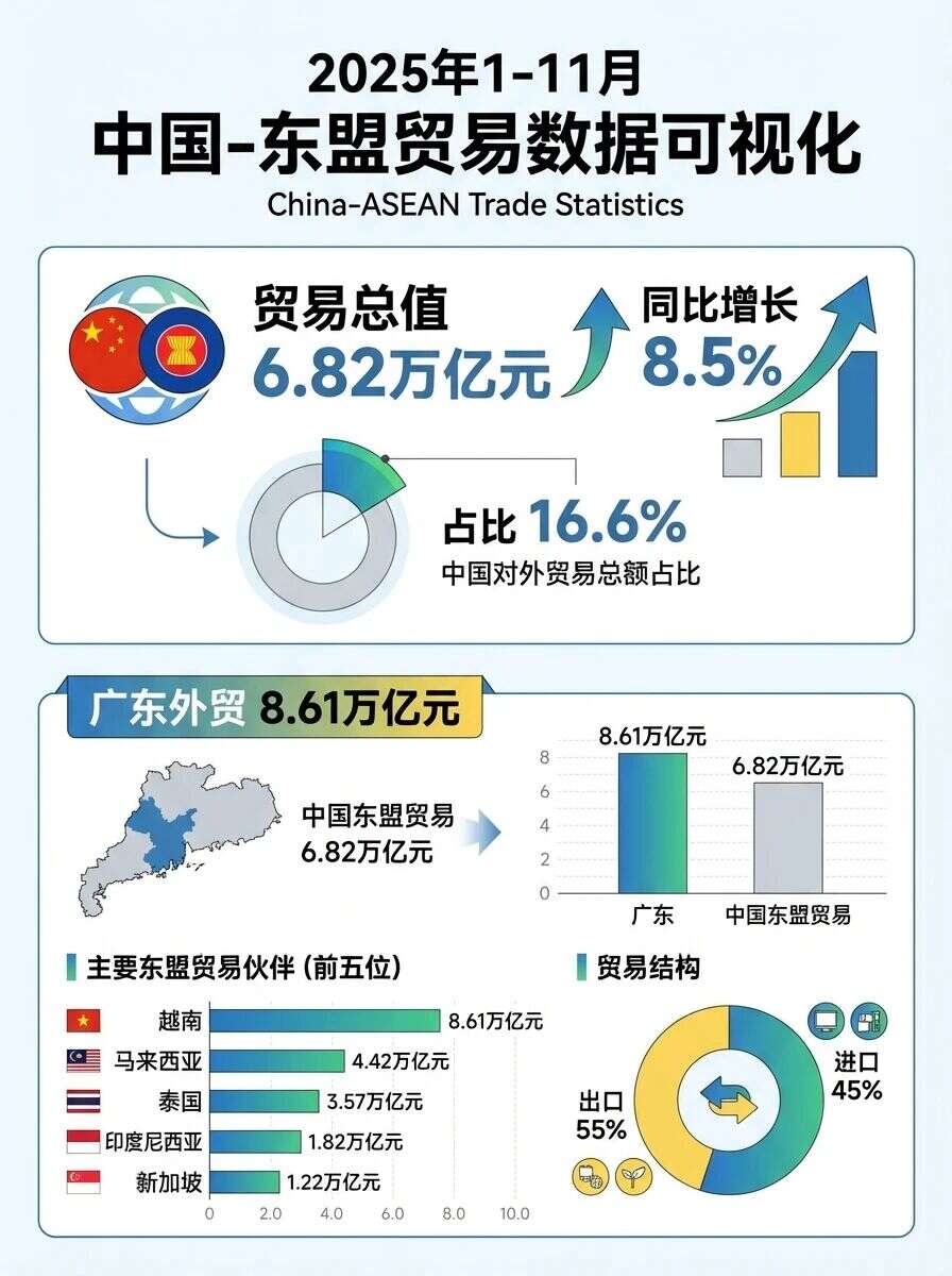 海关总署数据显示,2025年前11个月,东盟继续保持中国第一大贸易伙伴地位,双边贸易总值达6.82万亿元人民币,同比增长8.5%,占中国外贸总值的16.6%。广东省外贸进出口总额达8.61万亿元人民币,同比增长4.2%。东南亚六国电商分化加剧,部分市场出现-23.34%的负增长。全球艺术玩具市场规模预计在2025年增长至420.7亿美元,年复合增长率高达18.72%。Temu在欧盟平均月活跃用户已达到1.16亿。