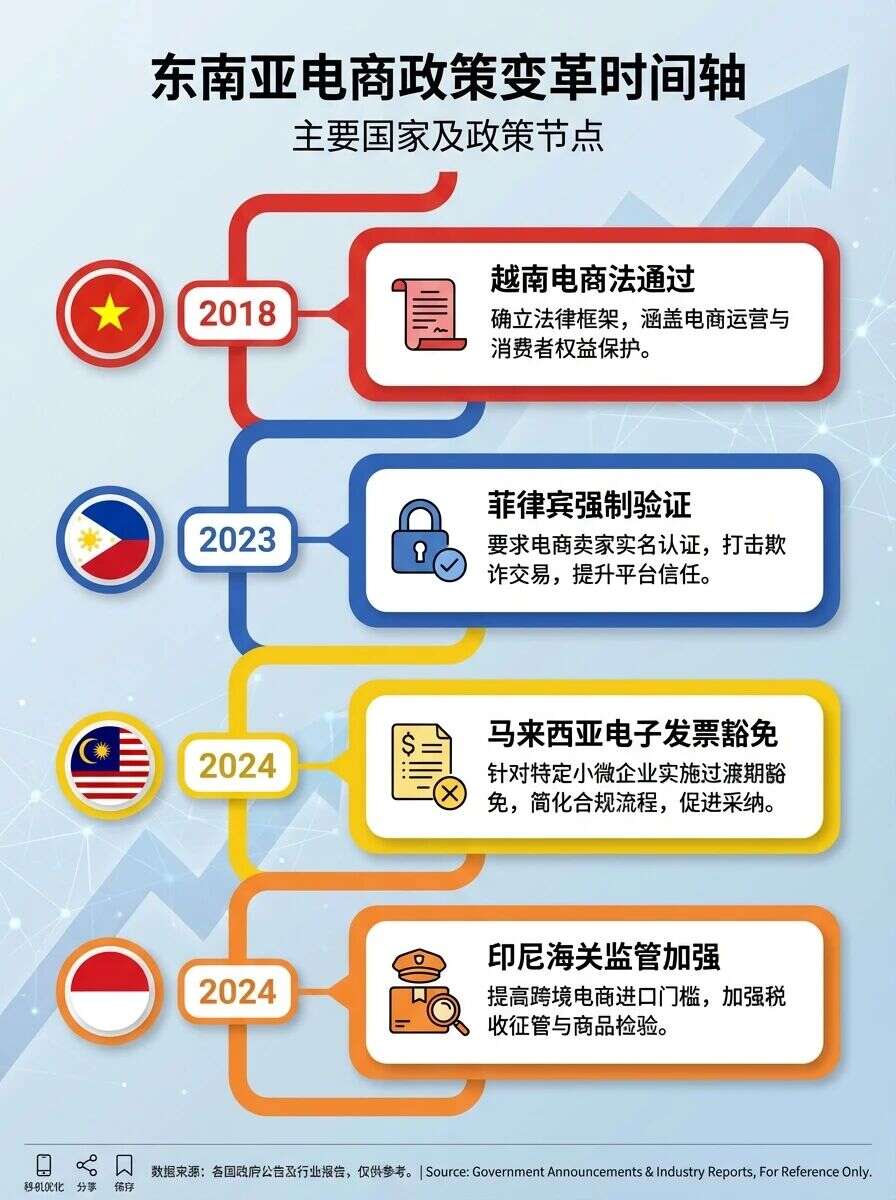 近期,东南亚多国同步推进电商合规化进程,平台政策密集调整。越南电商法正式通过,印尼加强海关监管,菲律宾强化税务验证,而TikTok Shop则推出"0元试运营"政策降低入驻门槛,显示市场在规范与扩张间寻求平衡。