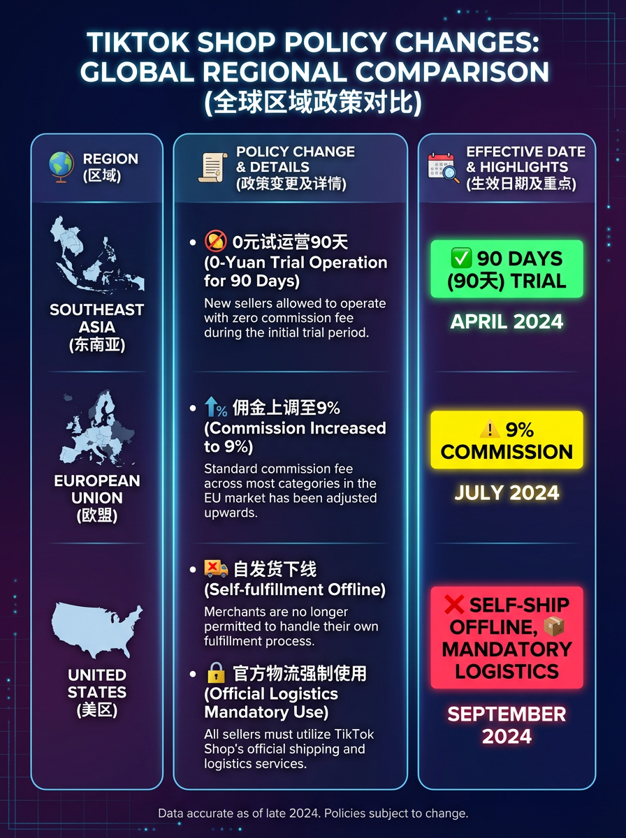 TikTok Shop东南亚站点推出"0元试运营"政策,12月15日正式上线,符合条件的新入驻跨境商家可享最高90天保证金豁免。同时,TikTok欧盟五国卖家佣金将于2026年1月8日起上调至9%。TikTok美区自发货功能将于2025年12月15日(PST)正式下线,跨境自运营商家必须使用官方物流。Shopee下月起对特定订单收取2%服务费,平台成本结构发生变化。