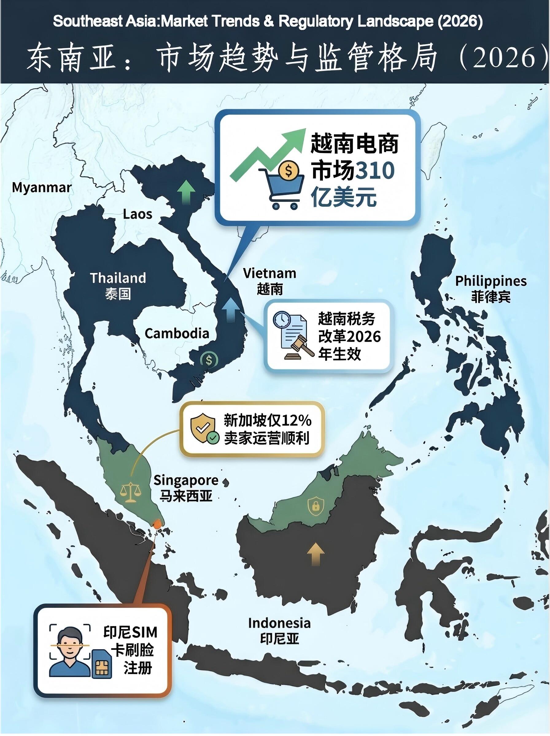 东南亚市场增长潜力巨大但合规要求趋严,越南税务改革与印尼身份验证新规需重点关注。提前准备营业执照、营收流水等材料,适应从野蛮生长到规范运营的转变。