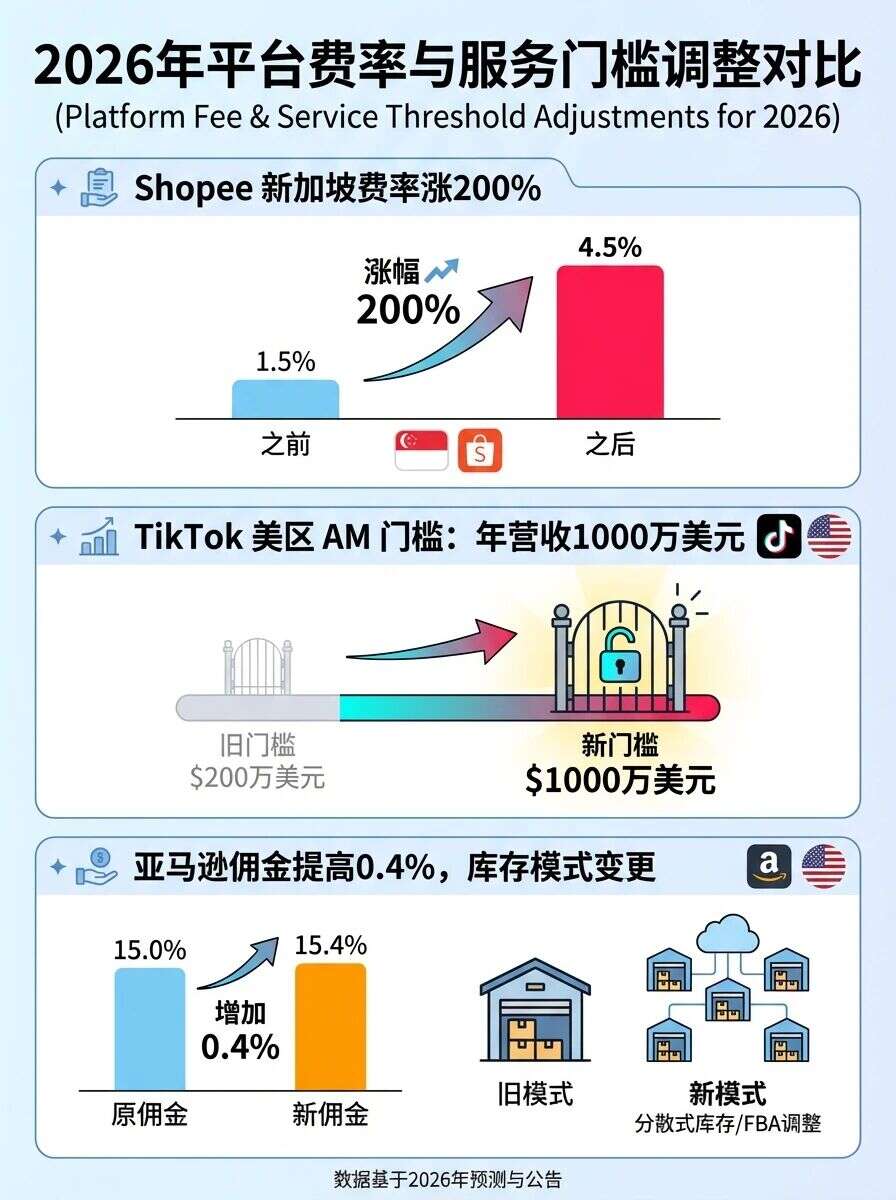 Shopee平台发布多项政策调整:新加坡本土店自2026年1月1日起将实施新服务费率,其中非商城本土店基础费率从1.09%调整为3.27%,涨幅达200%。同时,Shopee跨境店调整罚分清零规则,自2025年第四季度起,季度累积罚分清零时间调整为当季度最后一个星期一。