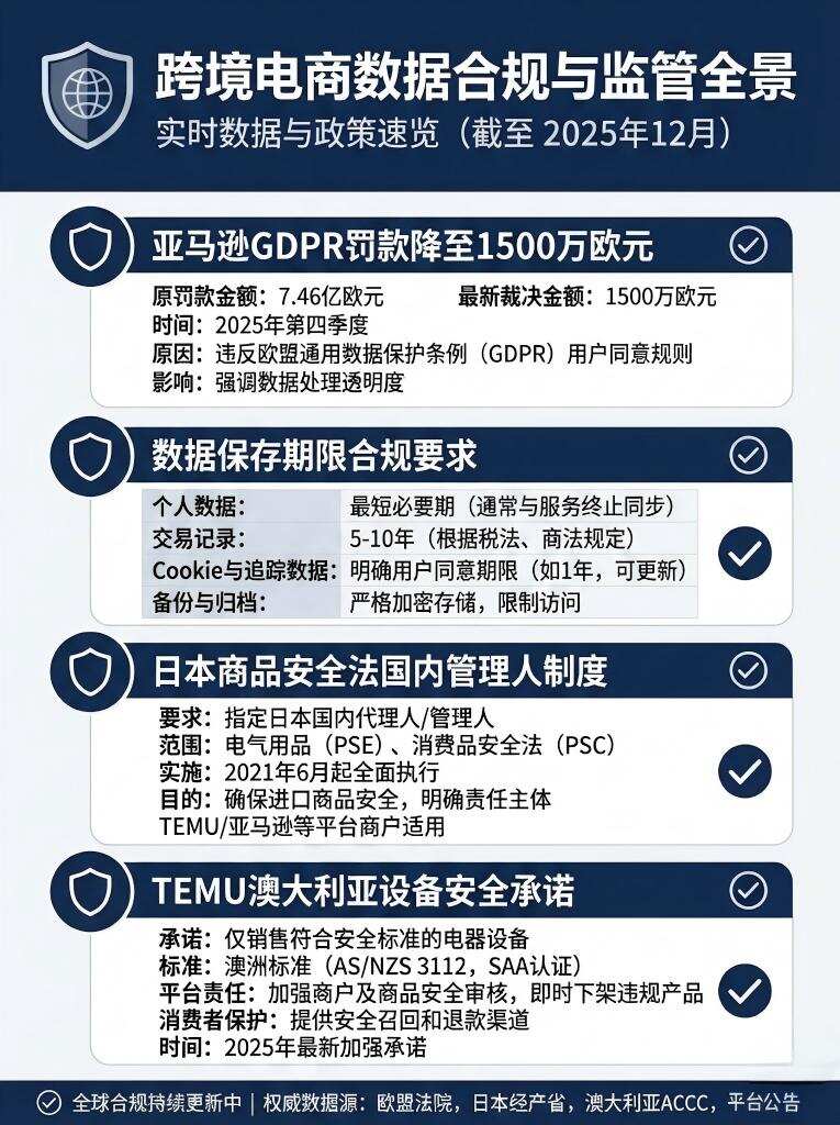 数据合规与平台竞争态势出现新变化。法国最高行政法院近日裁定,将法国数据保护机构对亚马逊法国物流公司的GDPR罚款从3200万欧元下调至1500万欧元,法院推翻了部分关于员工监控系统违法的认定,但维持了数据保存期限违规的裁定。亚马逊已切断ChatGPT对其数据的访问,以保护自身的流量入口及广告体系。TEMU在澳大利亚签署设备安全承诺,将主动下架非法通信设备以强化合规。日本商品安全法新规已生效,要求向日本销售特定商品的海外卖家必须指定国内管理人,否则商品将面临下架。