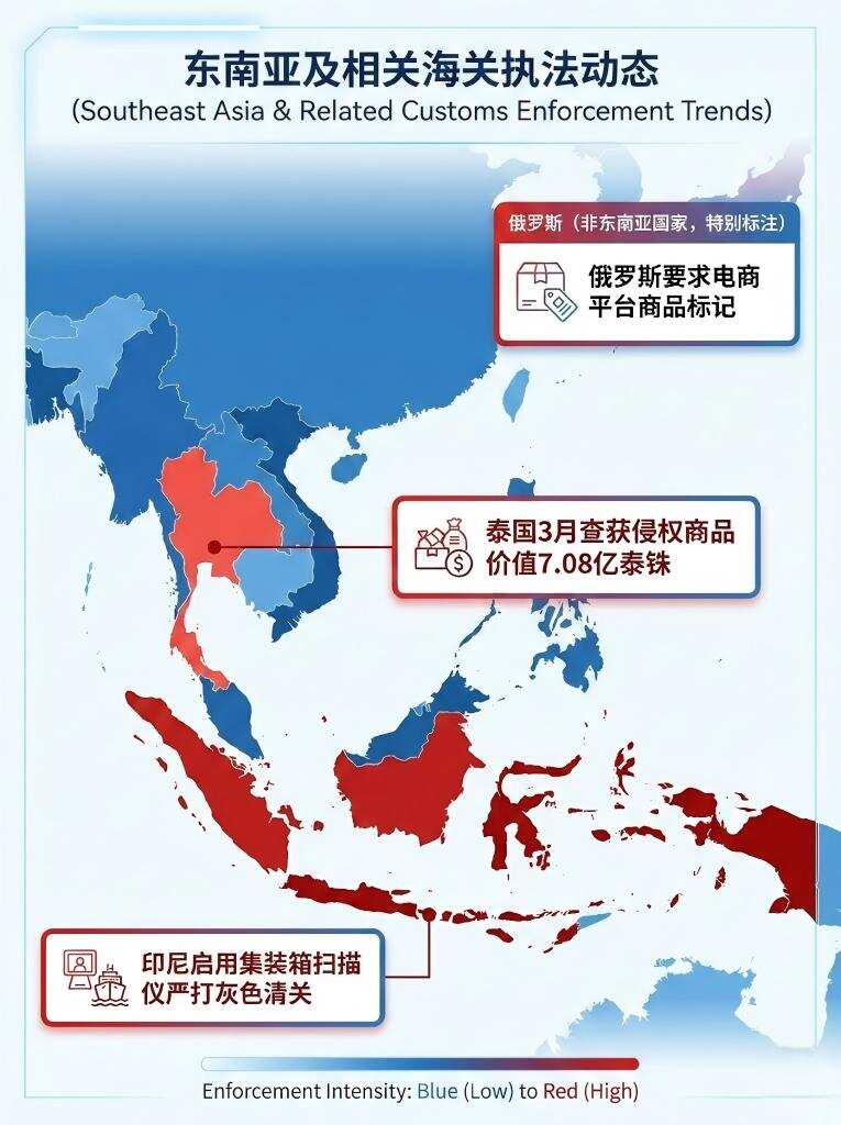 印尼近期严打灰色清关进口中国货物,海关启用集装箱扫描仪提升查验效率,并借助大数据与人工智能加强监管,同时开展查仓行动打击走私。泰国商务部知识产权局与海关联合执法,自2025年10月1日至12月22日共破获23起假冒商品走私案件,缴获侵权商品超过8万件,涉案总价值高达7.08亿泰铢。俄罗斯正推进支付数字化,并要求电商平台全面遵循商品标记规定,禁止展示未注册商品。