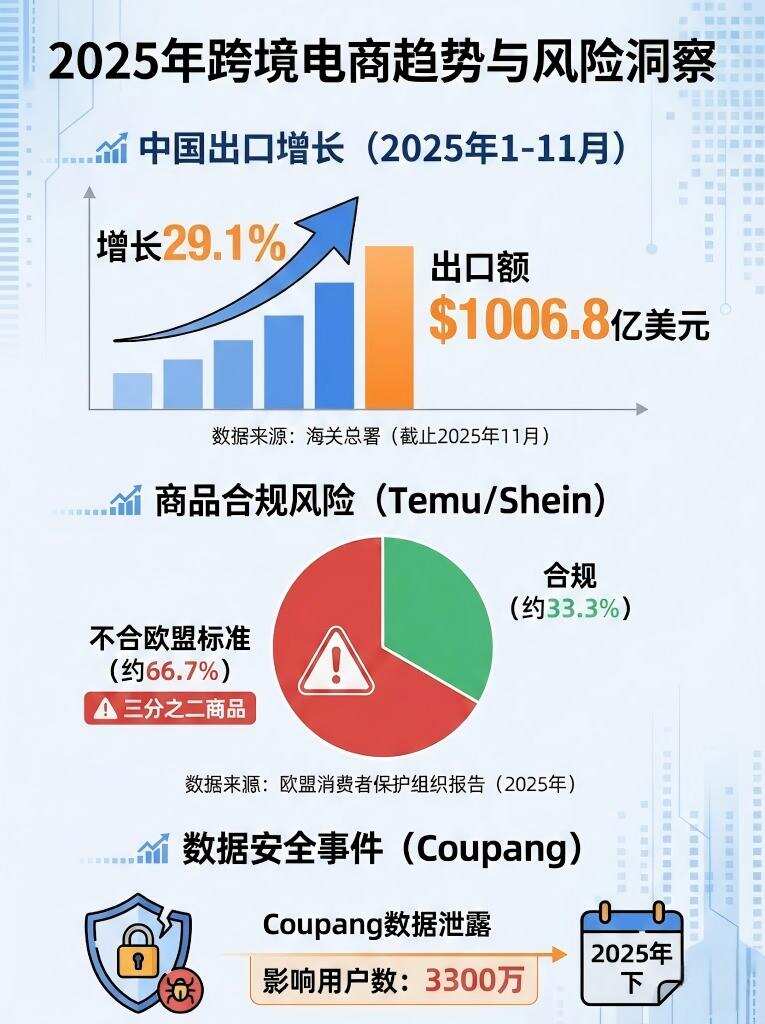 欧盟多国消费者组织联合测试发现,Temu和Shein平台上约三分之二商品不符合欧盟安全标准,其中Shein违规比例达73%,Temu为65%。韩国电商巨头Coupang发生数据泄露事件,实际影响用户超过3300万,涵盖姓名、邮箱、地址和订单等多项信息。市场数据方面,2025年1-11月中国个人跨境电商商品出口总额达1006.8亿美元,同比增长29.1%,对欧盟出口额247.2亿美元,同比增长52.9%。