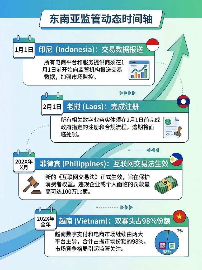 菲律宾电商监管进入执行阶段,Shopee正全面收紧平台规则以落实《互联网交易法》。新规要求在线商品必须清晰披露价格、品牌、描述及卖家联系方式,违规卖家或平台可能面临5,000至100万比索的罚款。菲律宾贸工部已获权对非法商品发布下架令,并可能建立不合规平台黑名单。在印尼,税务局新规要求支付服务商和电子钱包管理者自1月1日起向税务部门报送用户交易数据。老挝要求所有电商经营者须在2月1日前完成注册。越南电商市场呈现双寡头格局,Shopee与TikTok Shop合计占据约98%份额。