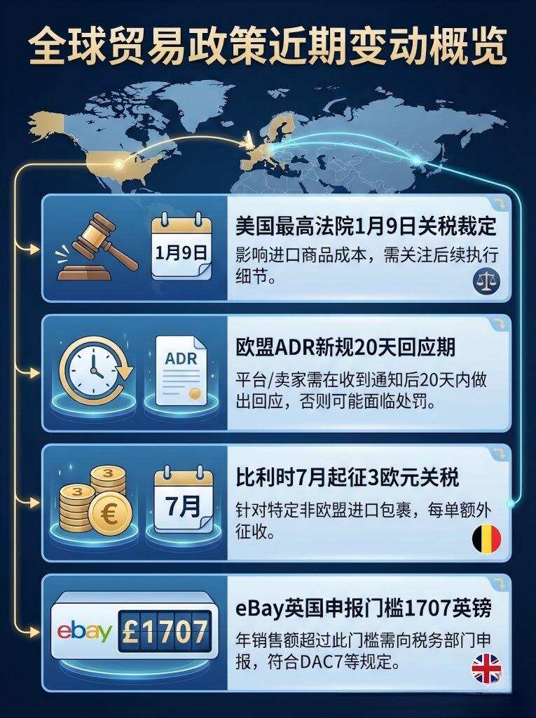 全球贸易政策不确定性持续,1月9日美国最高法院裁定将影响关税走向。卖家需关注欧美争议解决新规,建立快速响应机制,同时评估比利时等市场关税成本变化。