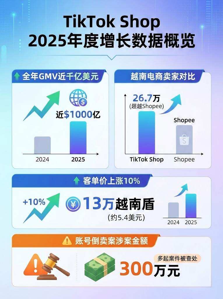 TikTok Shop在2025年实现显著增长,全年GMV接近千亿美元,位列海外主流电商平台第五,增速全球领先。平台活跃消费者已达4亿,第四季度GMV突破250亿美元。在越南市场,2025年上半年TikTok Shop活跃卖家数量激增96%至26.7万,首次超越Shopee的21万。同时,平台客单价同比上涨10%至13万越南盾。在合规方面,TikTok Shop官方通报两起账号倒卖案件,其中福建泉州特大账号倒卖案嫌疑人非法获利超300万元已被抓获。平台还升级了发货履约监测机制,延迟发货率超标将面临订单限制和罚款。