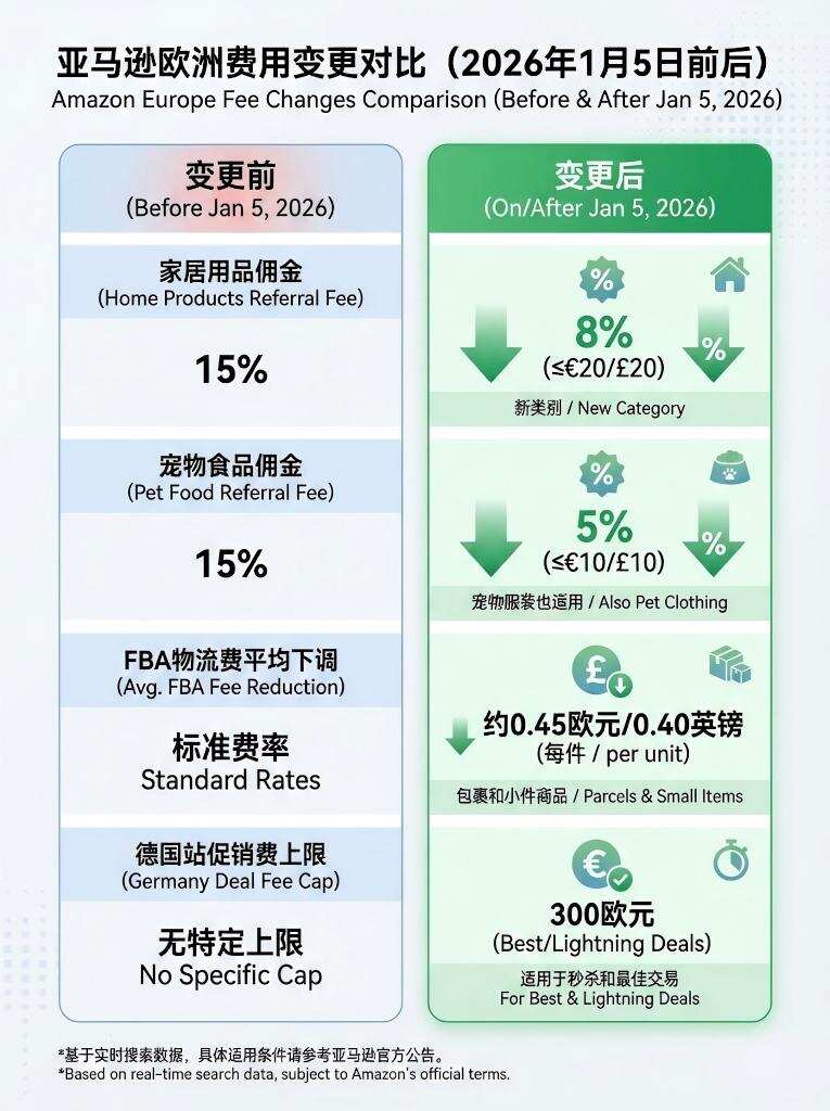亚马逊欧洲站新规已于1月5日正式落地,多个日常消费类目销售佣金及FBA物流费用获得减免。具体而言,售价20欧元以下的家居用品佣金从15%降至8%;售价10欧元以下的宠物服饰、宠物食品及维生素等商品佣金降至5%,部分品类费率降幅达10个百分点。同时,售价20欧元以下商品的FBA物流费平均每件下调约0.45欧元。德国站促销活动可变费用上限统一为300欧元。此外,亚马逊自1月26日起将调整FBM退款政策,退款处理期延长但超时未处理将触发自动退款。