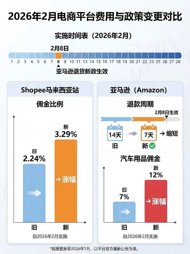 Shopee宣布自2026年2月起实施多项费用调整:马来西亚站本土普通卖家佣金费率将上调,订单价值不超过40令吉的部分从2.24%提高至3.29%,超过40令吉部分从2.28%提高至3.31%。同时,多数商品类目佣金费率将普遍上调,如汽车用品从7%升至12%,电子产品等类目统一调至11%/15%。履约要求同步收紧,优选卖家与商城卖家的快速交接率门槛将分阶段提升至不低于50%。亚马逊美国站则将于2026年2月8日起强制所有卖家使用亚马逊预付退货标签(APRL),取消高价值商品豁免,退款周期从14天缩短至7天。