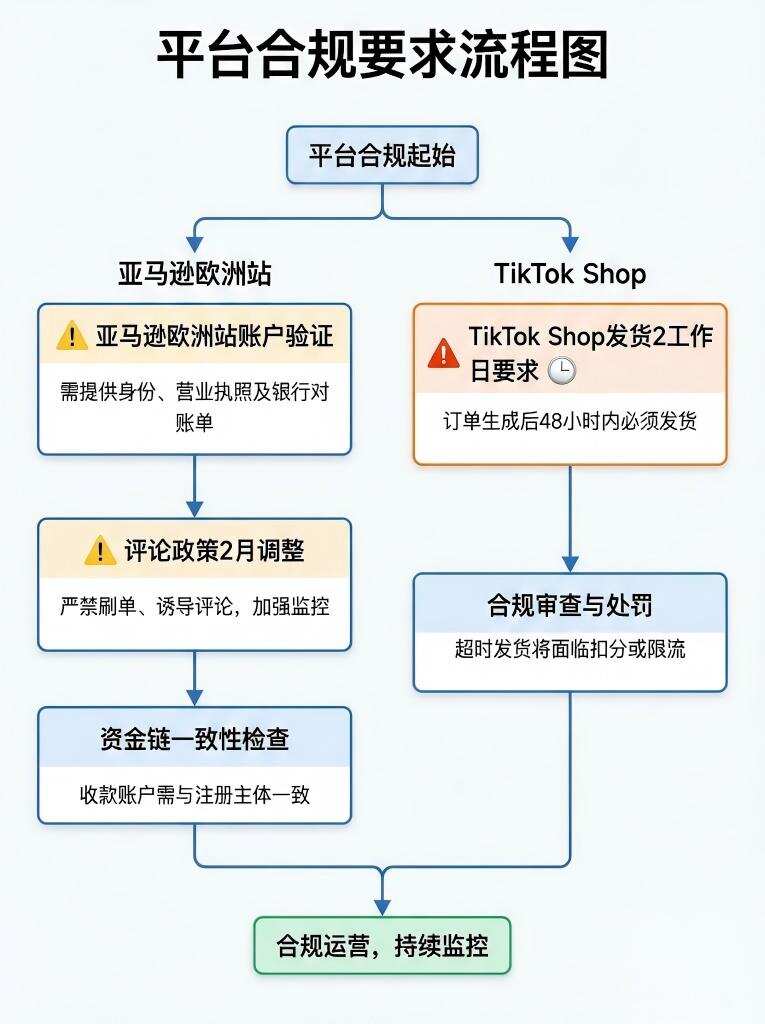 亚马逊欧洲站自2025年末至2026年初对本土号进行新一轮风控核查,英国与北爱尔兰站点出现大量账户验证与停用提示,审核重点转向账户主体与资金链的一致性检查。亚马逊同时调整评论政策,自2026年2月起评论将仅在同系列小差异变体间共享。TikTok Shop升级发货履约监测机制,新规分两阶段执行,最终要求订单在创建后2个工作日内更新为运输中状态,延迟发货率过高将面临订单限制、结算延迟及罚款。
