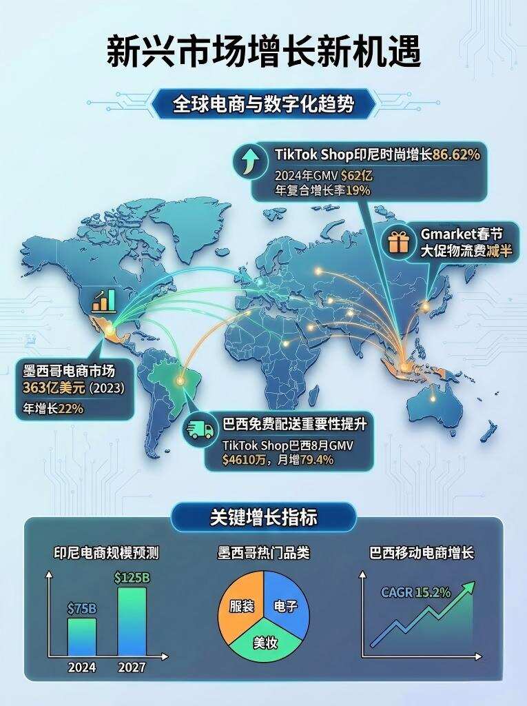 TikTok Shop在印尼市场表现强劲,与Tokopedia联合推出的时尚游乐场线下活动推动参与品牌的平均交易额提升86.62%。墨西哥电商市场正迈向成熟,预计到2026年其市场规模将超过351亿美元。韩国电商平台Gmarket与Auction将于1月26日至2月12日举办春节大促,为卖家提供物流费用减半等激励措施。巴西消费者行为趋于理性,预计到2026年,免费配送将与商品折扣同等重要地影响其网购决策。