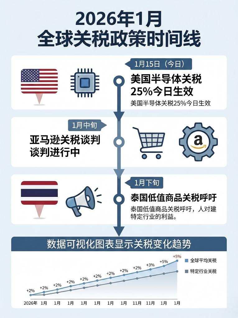 美国白宫宣布自2026年1月15日起,对部分进口的半导体、半导体制造设备及其衍生产品加征25%的进口从价关税。数据中心和研发等领域相关产品,以及加征关税的乘用车和钢铁等产品不在重复征税范围内。与此同时,随着美国对中国商品的平均关税从约57%降至47%,亚马逊已开始与供应商重新谈判,要求下调供货价格以维持其低价策略,部分供应商被要求提供最高30%的折扣。泰国电商行业则呼吁提高低价值商品进口关税税率,旨在促进国产与进口商品的公平竞争。