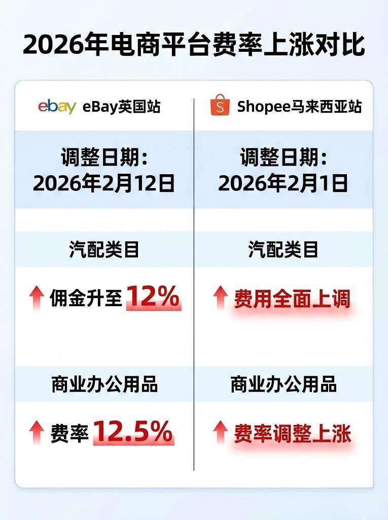 eBay宣布自2026年2月12日起上调英国站企业卖家费用,订单金额高于10英镑的交易,每笔订单的成交服务费将从30便士增至40便士。多个类目成交服务费比例同步调整:商业、办公与工业用品类目费率从11.90%升至12.50%;车辆零部件与配件类目调整为销售额不超过750英镑部分费率为9.5%,超出部分为3%。Shopee马来西亚站自2026年2月1日起调整本土普通店铺卖家佣金结构,订单金额40令吉及以下部分佣金费率从2.24%上调至3.29%,超过40令吉部分从2.28%提升至3.31%。