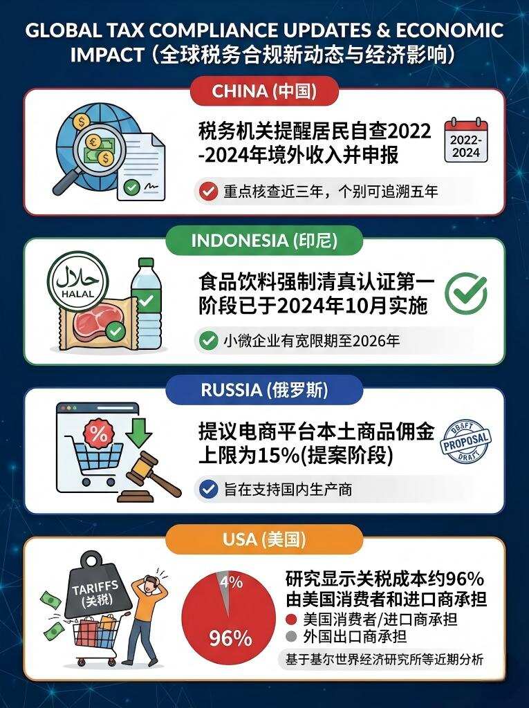 中国税务机关持续加强居民个人境外所得纳税监管,已提醒纳税人对2022至2024年境外收入开展自查,未申报或计算错误可能导致追缴税款及滞纳金。印尼政府规定自2026年10月起,所有食品饮料经营主体须强制取得清真认证。俄罗斯拟设定电商平台本土商品佣金上限不超过15%,并要求平台标明商品原产国,防止对俄罗斯商品的歧视性展示。德国基尔世界经济研究所研究显示,美国加征关税所产生的额外成本96%由美国的进口商和消费者承受,而非外国出口商。