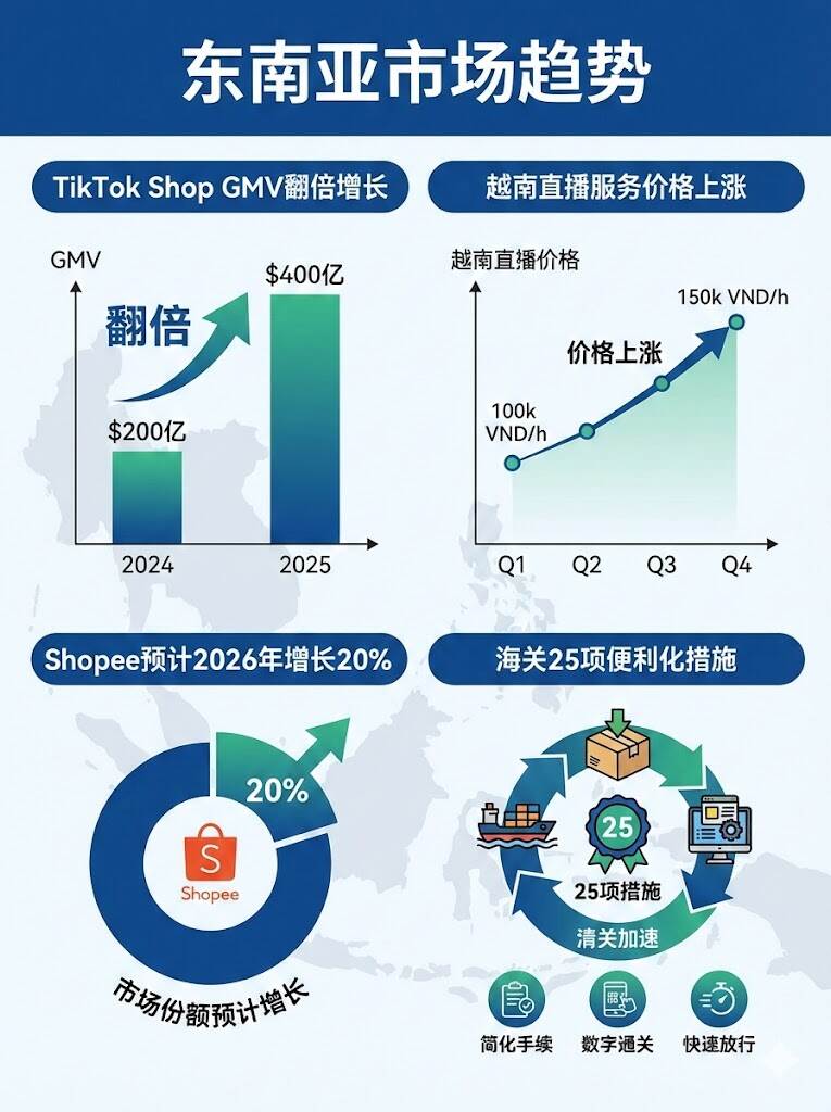 TikTok Shop东南亚跨境电商在2025年实现了规模翻倍,年度GMV达到2024年同期的两倍以上,日均GMV同比提升90%。核心大促表现强劲,双12期间短视频带货GMV同比暴涨257%。随着越南农历新年旺季临近,直播带货服务需求激增,导致服务价格大幅上涨,全包套餐起价达3000万越南盾,单场直播费用在300万至1000万越南盾之间。马来亚银行投资银行报告预计Shopee 2026年GMV将增长20%,利润率有望小幅扩张。海关总署宣布在全国范围内复制推广25项跨境贸易便利化措施,重点聚焦促进跨境物流高效畅通。