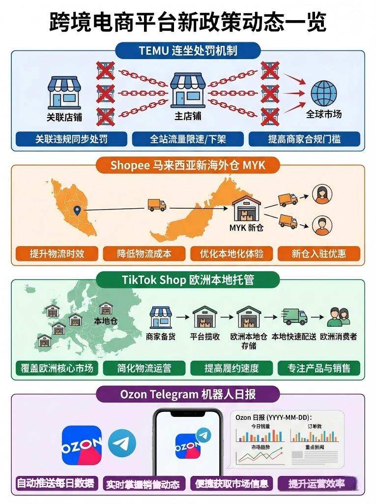 TEMU近期升级店铺违规处罚机制,引入"连坐"制度,对关联店铺进行连带约束。在24周统计周期内,若商家任一店铺被评为"较差"等级,其所有关联店铺的定制商品上架权限将受限,三次及以上违规最高可冻结上新权限30天。Shopee马来西亚站点已于1月16日起启用新的官方海外仓(代码MYK),原仓库代码MYB将逐步停用。TikTok Shop为加码欧洲市场推出"本地托管"物流新模式,要求卖家将商品提前备货至欧洲本地仓库。俄罗斯电商平台Ozon推出专为卖家设计的Telegram聊天机器人,每日发送销售数据、供应状况等超过20个关键指标的日报。