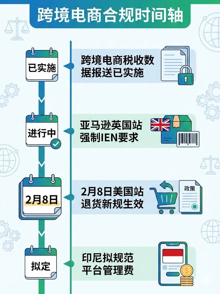 多国电商合规要求持续收紧。印尼政府正着手制定新规,规范Shopee、Tokopedia等平台的管理费和佣金,旨在保护中小微企业。政策方向包括为11类本地生产商品设定进口最低价,要求部分商品具备商业识别号和印尼国家标准。亚马逊英国站严格执行IEN(进口条目编号)上传政策,未及时提供的卖家将被限制创建新货件。跨境电商税收合规也成焦点,亚马逊等平台已按季度向中国税务机关报送卖家销售数据。此外,亚马逊宣布自2月8日起对美国站全面推行"亚马逊预付退货标签",取消高价值商品豁免,几乎所有品类均须强制使用标准化退货流程。