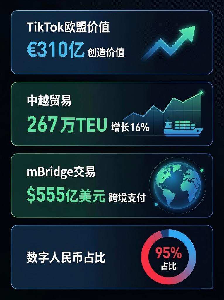 最新市场数据显示多个增长亮点。根据独立研究机构Public First研究,TikTok在2025年为欧盟经济带来显著拉动效应,欧盟企业通过TikTok广告创造了约310亿欧元经济价值,并直接推动约20亿欧元跨境销售额。中越贸易方面,2025年1-11月中国至越南集装箱贸易量达267万TEU,同比增长16%,连续第二年位居亚洲内国家间贸易首位。贸易结构向高附加值转变,中间产品和资本货物份额上升。数字人民币国际化进展显著,跨境央行数字货币平台mBridge累计交易规模已超过555亿美元,较2022年项目初期增长约2500倍。