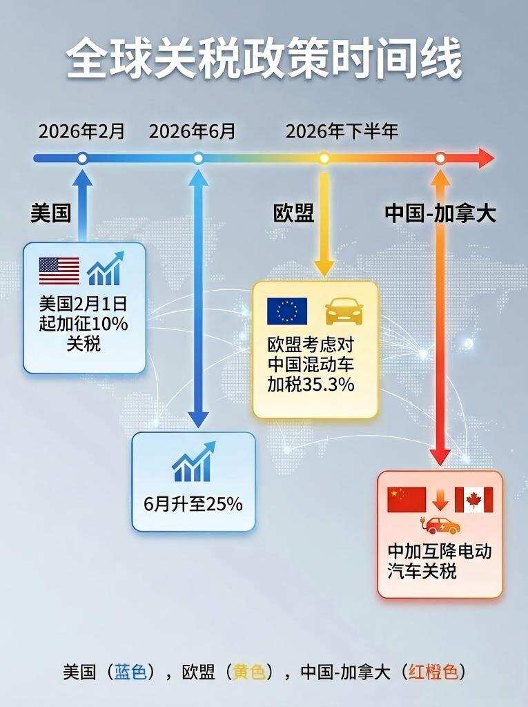 美国关税政策已开始实际影响跨境电商。亚马逊CEO安迪·贾西指出,因特朗普实施的进口关税政策,平台部分商品价格已开始上涨。卖家库存缓冲在去年秋季基本耗尽,新增成本正部分转嫁给消费者。同时,特朗普宣布自2026年2月1日起,对丹麦、挪威、瑞典、法国、德国、英国、荷兰和芬兰出口至美国的所有商品加征10%关税,6月1日起税率将提高至25%。欧盟方面正考虑对中国混合动力汽车加征35.3%的关税,叠加现有税率后总税负或达45%。与此形成对比的是,中加达成关税互降协议,加拿大将降低部分中国电动汽车关税,给予每年4.9万辆配额。
