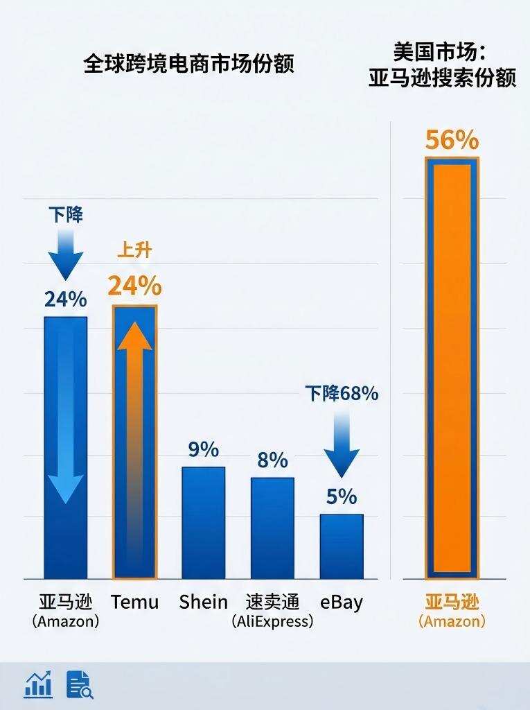 传统平台优势正被新兴力量挑战,Temu的快速崛起与亚马逊份额下滑形成鲜明对比。卖家需重新评估渠道布局,考虑多平台运营以分散风险。