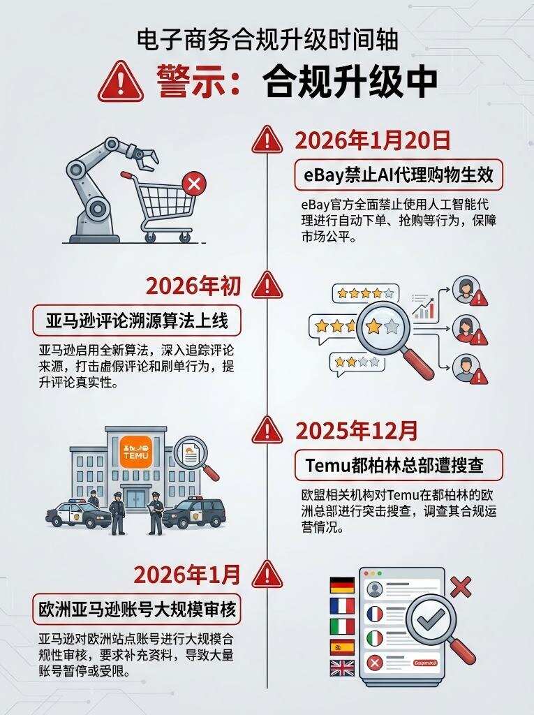 平台合规监管持续升级。eBay新规自2026年1月20日起生效,明确禁止用户使用代理式购物的人工智能技术。亚马逊近期强化合规监管,上线评论溯源算法,对刷单行为实施品牌级连坐处罚,已导致3C、家居等多类目卖家账号遭封。欧洲本土亚马逊账号遭遇大规模审核,卖家普遍面临KYC审核延迟、资金提现受阻等问题,平台审核已从单纯的材料验证升级为主体身份+资金经营逻辑的双重核查。