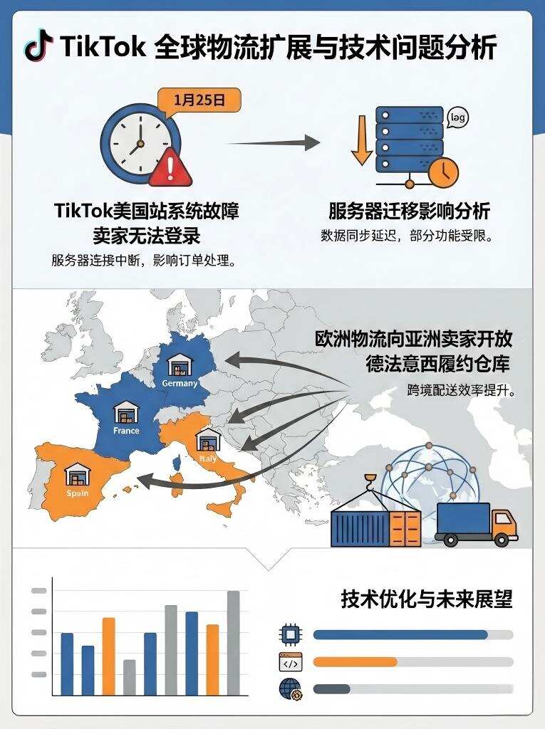 1月25日下午,TikTok美国站发生系统故障,导致大量卖家无法登录创作者中心、处理图片等功能异常,产品发布、订单处理、库存同步等核心功能受限。平台官方于17时32分发布紧急通知,确认商家系统出现异常。分析认为故障可能与美区服务器从中国字节跳动向美国控股方迁移有关。与此同时,TikTok Shop欧洲物流服务已向亚洲卖家开放,并在德国、法国、意大利和西班牙设立了履约仓库,以提升物流效率。