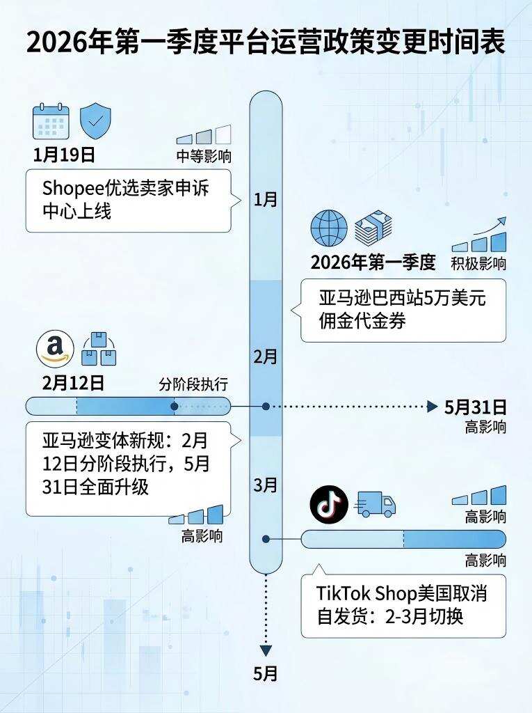 TikTok Shop美国站将逐步取消卖家自发货模式,自2026年初起所有订单需统一通过平台管理的物流服务履约。已入驻卖家将在2月底至3月底分阶段切换。亚马逊近期针对违规变体展开大规模清理,为新规铺路——自2月12日起分阶段执行、5月31日全面升级,仅允许颜色、尺寸等不影响核心功能的变体共享评论。Shopee自1月19日起上线"优选卖家申诉中心",允许面临资格丧失风险的卖家提交申诉。亚马逊巴西站则推出新卖家福利,品牌卖家可获得最高约5万美元的预付佣金代金券。