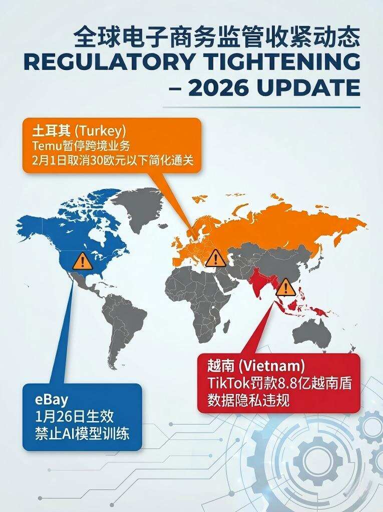 Temu已于1月26日暂停在土耳其的所有跨境销售业务,仅展示提供土耳其境内配送服务的本地卖家商品。这一重大调整发生在土耳其竞争管理局对Temu伊斯坦布尔办公室进行现场检查后,与土耳其贸易部宣布自2月1日起取消30欧元以下商品简化通关程序的政策密切相关。越南方面,竞争委员会对TikTok处以8.8亿越南盾罚款,对Zalo运营方VNG Corp罚款8.1亿越南盾,主要因用户数据收集和使用违规。eBay新规已于1月26日生效,明确禁止使用平台数据训练或优化AI模型。
