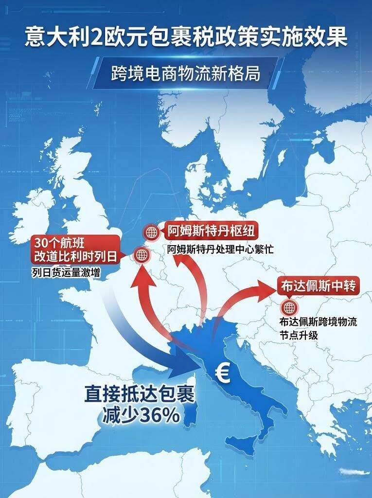 意大利对华小包裹征税政策实施首月效果显现。自2026年1月1日起对来自非欧盟国家、价值不超过150欧元的包裹征收2欧元关税的政策,实施后出现意外效果。根据意大利海关数据,1月1日至20日直接抵达意大利的低价值包裹数量较去年同期减少36%。至少30个原定到达米兰马尔彭萨机场的货运航班已改道至比利时列日、阿姆斯特丹等欧盟枢纽,利用欧盟单一市场规则规避意大利关税。