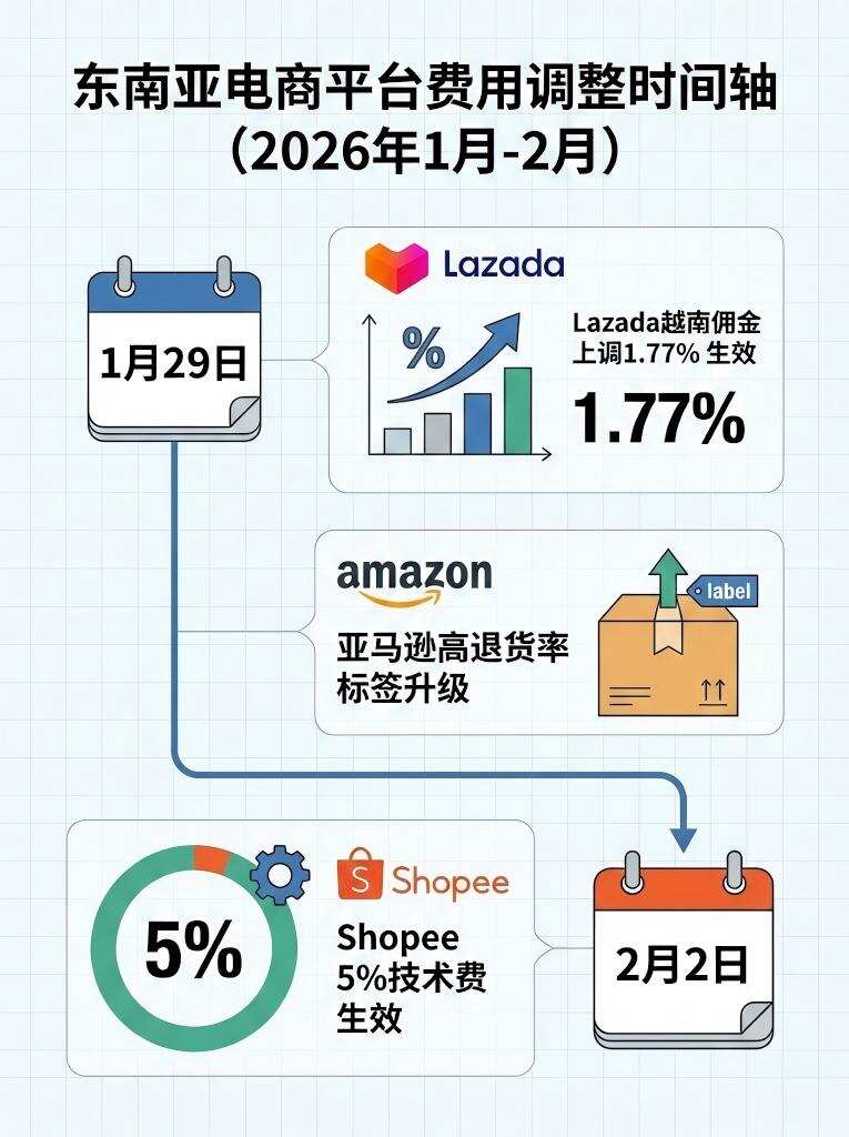与此同时,Lazada越南站点自2026年1月29日起,将跨境小包直邮商品的佣金费率上调1.77%(含增值税),本地履约商品费率保持不变。在平台治理方面,亚马逊近期显著升级了"高退货率"商品标签,将其置于商品标题下方最显眼位置,并新增了由AI分析得出的具体退货原因说明,这一变动已对部分卖家的转化率产生影响。