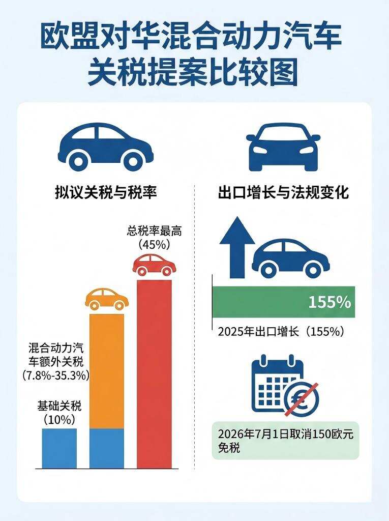欧盟税务监管持续收紧。欧盟正在考虑对中国混合动力汽车实施额外7.8%至35.3%的关税,这将使得总税率在现有10%的基础关税上最高可达45%。此举是因中国混动车在欧盟的出口量激增,预计到2025年同比增长155%,远高于纯电动车的12%增幅。同时,2026年7月1日欧盟将取消150欧元以下包裹免税政策,彻底改变依赖"国内直邮+极限低价"的旧模式。
