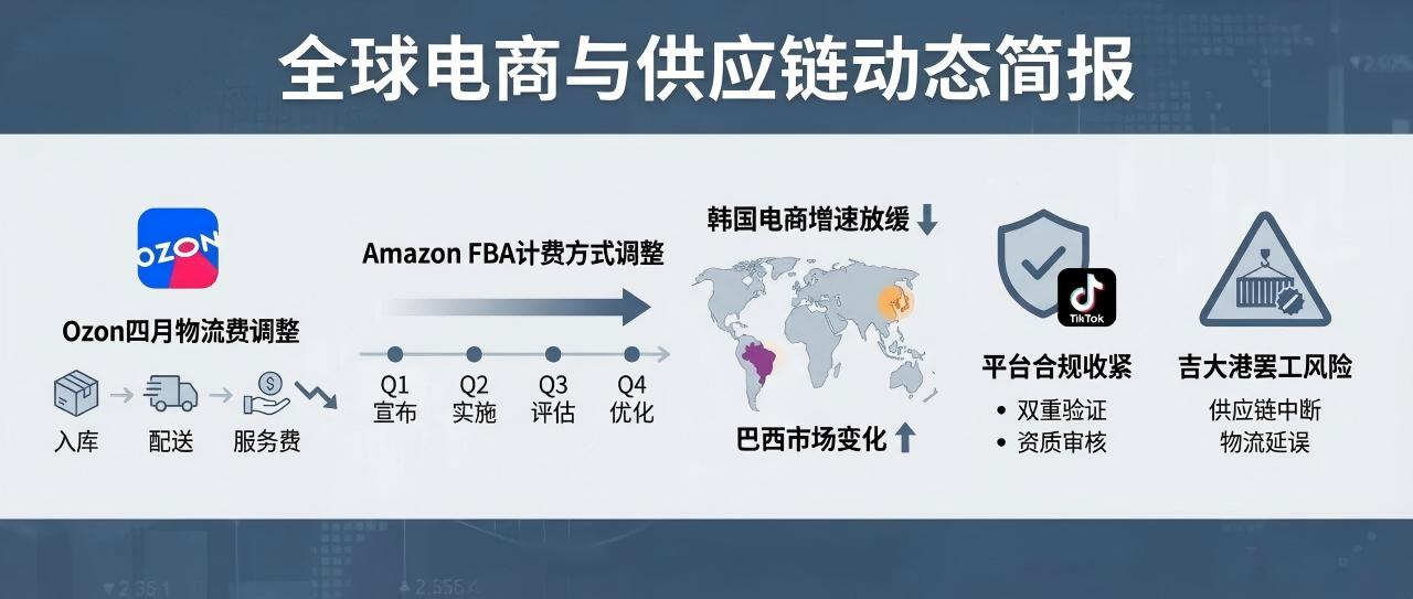 近期,多个跨境电商平台相继推出费率与规则调整,从物流计费到账户安全,从市场准入到合规要求,全球电商生态正经历系统性优化。Ozon宣布四月起简化物流费用结构,亚马逊调整FBA移除计费方式,Shopee收紧延迟发货红线,TikTok Shop强化账户安全验证,一系列变化指向平台运营精细化与合规化趋势。