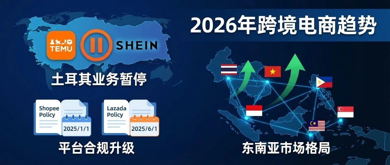 近期,跨境电商平台密集调整运营策略与合规要求,TEMU与SHEIN基于土耳其市场环境变化暂停跨境业务,Shopee、Lazada等平台则更新佣金政策与卖家管理规则。同时,春节物流安排与新兴市场增长数据为跨境卖家提供了关键的运营参考。