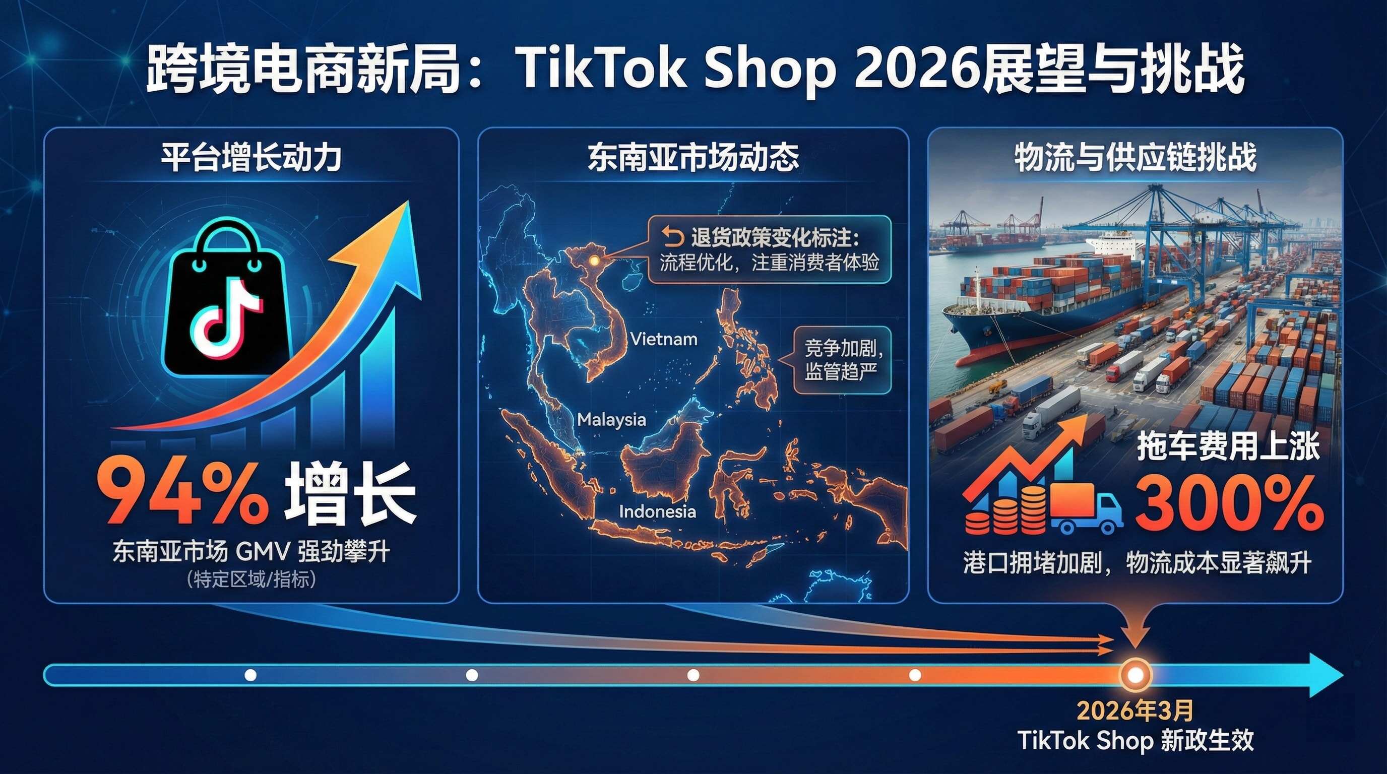 近期,多个跨境电商平台密集调整运营政策,东南亚市场退货规则迎来重大变革。同时,春节物流高峰引发港口拥堵危机,拖车费用暴涨近300%,而TikTok Shop全球GMV在2025年实现94%的惊人增长,显示社交电商持续强劲势头。